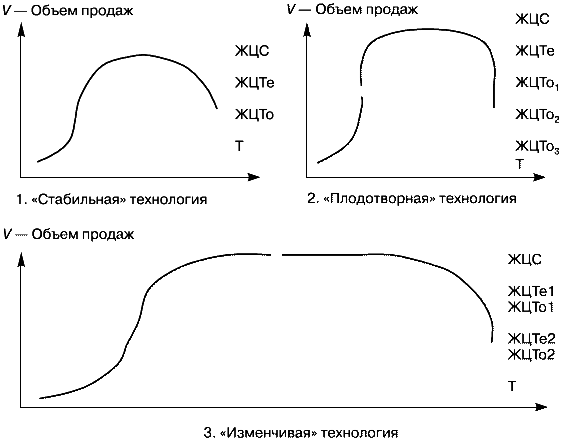 Рис. 2.6. Сочетание жизненных циклов спроса, Стабильная технология в основном остается неизменной в течение ЖЦС (например, производство автомобилей ранних марок). Получается по одной кривой ЖЦС, ЖЦТе и ЖЦТо. Плодотворная технология, как и в случае стабильной технологии, сохраняется неизменной длительный период. Но при этом имеет место разработка сменяющих друг друга новых поколений продукции с лучшими показателями и более широким диапазоном применения. В рамках плодотворной технологии (например, в области современной вычислительной техники) разработка новых видов продукции становится решающим фактором достижения экономического успеха. Новейший продукт с наилучшими показателями захватывает рынок. Однако его ведущая роль может оказаться краткосрочной из-за появления столь же или более эффективных продуктов, предлагаемых конкурентами. В результате фирмы находятся под постоянным давлением необходимости технологических инноваций. Изменчивая технология характеризуется тем, что в течение ЖЦС, помимо новых изделий, наблюдается появление сменяющих друг друга базовых технологий. Например, спрос на усилители слабых электрических сигналов возник в начале текущего столетия и связан с изобретением электровакуумных ламп. Хотя и в настоящее время спрос на них ускоренно растет, произошли по крайней мере три коренные смены технологии: вакуумные лампы сменились транзисторами, те были заменены миниатюрными, а потом и микроминиатюрными схемами.