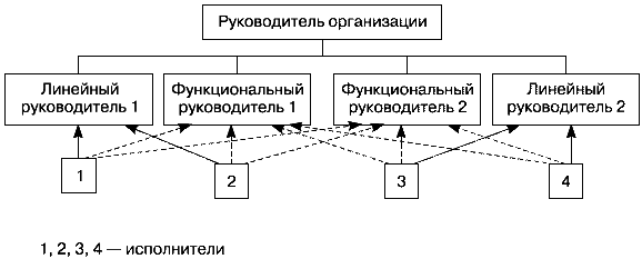 Рис. 4.1. Линейная организационная структура При функциональной системе каждый работник подчиняется нескольким руководителям, получает от них указания и отчитывается о своей деятельности. Достоинства: более компетентное решение специальных вопросов по сравнению с линейной системой, наличие специалистов, освобождение линейных руководителей от решения некоторых специальных вопросов. Недостатки: падение уровня исполнительской дисциплины, падение принципа единоначалия, расплывчатость в распределении функций и подчиненности, чрезмерная заинтересованность в реализации целей и задач в своих подразделениях. В чистом виде встречается редко, чаще в виде функциональных отделов других организационных структур: производственных, финансовых, бухгалтерии, снабжения, управления персоналом, юридических и т. д. (рис. 4.2).