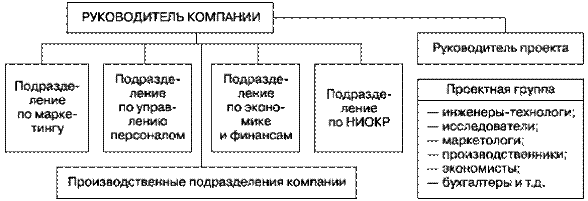 Рис. 4.8. Особенности организации стратегической инновации Для адаптивных (гибких, органических) организационных структур характерны отсутствие бюрократической регламентации деятельности органов управления, отсутствие детального разделения труда по видам работ, размытость уровней управления и небольшое их количество, гибкость структуры управления, децентрализация принятия решений, индивидуальная ответственность каждого работника за общие результаты деятельности. Кроме того адаптивные организационные структуры, как правило, характеризуются следующими признаками: ● способностью сравнительно легко менять свою форму, приспосабливаться к изменяющимся условиям; ● ориентацией на ускоренную реализацию сложных проектов, комплексных программ, решение сложных проблем; ● ограниченным действием во времени, т. е. формированием на временной основе на период решения проблемы, выполнения проекта, программы; ● созданием временных органов управления. К разновидностям структур адаптивного типа можно отнести проектные, матричные, программно-целевые, проблемно-целевые, структуры, основанные на групповом подходе (командные, проблемно-групповые, бригадные), сетевые организационные структуры. Проектные структуры это структуры управления комплексными видами деятельности, которые из-за их решающего значения для компании требуют обеспечения непрерывного координирующего и интегрирующего воздействия при жестких ограничениях по затратам, срокам и качеству работ. Существует несколько типов проектных структур. В качестве одной из разновидностей можно привести так называемые чистые, или сводные, проектные структуры управления, подразумевающие формирование специального подразделения проектной команды, работающей на временной основе. Временная группа специалистов в сущности представляет собой уменьшенную по масштабам копию постоянной функциональной структуры данной компании (рис. 4.10). Правда, на практике эти проектные команды редко находят отражение на формальных схемах организационных структур управления. В состав временных групп включают необходимых специалистов: инженеров, бухгалтеров, руководителей производства, исследователей, а также специалистов по управлению. Руководитель проекта наделяется проектными полномочиями (полной властью и правами контроля в рамках конкретного проекта). Руководитель отвечает за все виды деятельности от начала до полного завершения проекта или какой-либо его части. В его функции входит определение концепции и целей проектного управления, формирование проектной структуры, распределение задач между специалистами, планирование и организация выполнения работ, координация действий исполнителей. Ему полностью подчинены все члены команды и все выделенные для этой цели ресурсы. В число проектных полномочий руководителя проекта входит ответственность за планирование проекта, за составление графика и ход выполнения работ, за расходование выделенных ресурсов, в том числе и за материальное поощрение работающих. После завершения работ по проекту структура распадается, а персонал переходит в новую проектную структуру или возвращается на свою постоянную должность (при контрактной работе увольняется).