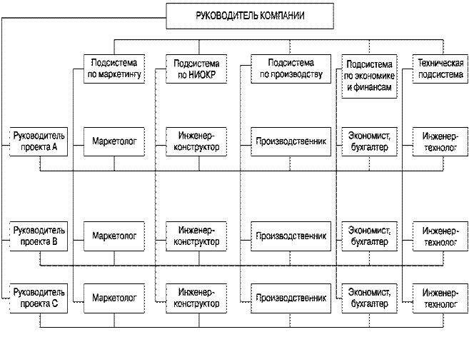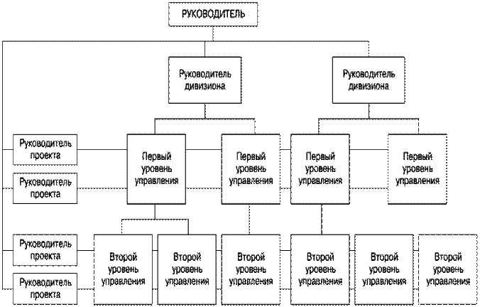 Рис. 4.11. Укрупненная схема матричной структуры управления Матричная структура чаще всего представляет собой наложение проектной структуры на постоянную для данной компании линейно-функциональную структуру управления Достоинствами матричной структуры являются следующие: ● интеграция различных видов деятельности компании в рамках реализуемых проектов, программ; ● получение высококачественных результатов по большому количеству проектов, программ, продуктов; ● значительная активизация деятельности руководителей и работников управленческого аппарата в результате формирования проектных (программных) команд, активно взаимодействующих с функциональными подразделениями, усиление взаимосвязи между ними; ● вовлечение руководителей всех уровней и специалистов в сферу активной творческой деятельности по реализации организационных проектов и прежде всего по ускоренному техническому совершенствованию производства; ● сокращение нагрузки на руководителей высшего уровня управления путем передачи полномочий принятия решений на средний уровень при сохранении единства координации и контроля за ключевыми решениями на высшем уровне; ● усиление личной ответственности конкретного руководителя как за проект (программу) в целом, так и за его элементы; ● достижение большей гибкости и скоординированности работ, чем в линейно-функциональных и дивизиональных организационных структурах управления, т. е. лучшее и более быстрое реагирование матричной структуры на изменение внешней среды; ● преодоление внутриорганизационных барьеров,что не должно мешать при этом развитию функциональной специализации. . Приведем перечень недостатков матричных структур. Он получился достаточно внушительным и содержит следующие негативные моменты: ● сложность матричной структуры для практической реализации: для ее внедрения необходима длительная подготовка работников и соответствующая организационная культура; ● структура сложна, громоздка и дорога не только во внедрении, но и в эксплуатации; ● она является трудной и порой непонятной формой организации; ● в связи с системой двойного подчинения подрывается принцип единоначалия, что часто приводит к конфликтам; в рамках этой структуры порождается двусмысленность роли исполнителя и его руководителей, что создает напряжение в отношениях между членами трудового коллектива компании; ● тенденция к анархии, нечетко распределены права и ответственность между ее элементами; ● характерна борьба за власть, так как в ее рамках четко не определены властные полномочия; ● чрезмерные накладные расходы в связи с тем, что требуется больше средств на содержание большего количества руководителей, а также порой на разрешение конфликтных ситуаций; ● трудности с перспективным использованием специалистов в данной компании; ● частичное дублирование функций; ● несвоевременно принимаются управленческие решения; как правило, характерно групповое принятие решений; ● конформизм в принятии групповых решений; ● нарушается традиционная система взаимосвязей между подразделениями; ● затрудняется и практически отсутствует полноценный контроль по уровням управления; ● считается абсолютно неэффективной в кризисные периоды. При этом следует отметить, что переход к матричным структурам, как правило, 