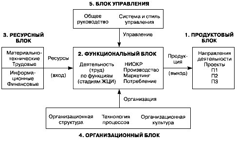 Рис. 5.2. Модель стратегического инновационного менеджмента Принципы общей экономической стратегии организаций представлены следующими положениями: ● стратегический план должен разрабатываться с точки зрения всей корпорации, а не отдельного индивида или подразделения; ● стратегический план должен обосновываться обширными исследованиями и фактическими данными; ● стратегические планы должны быть достаточно гибкими, чтобы при необходимости осуществлять их модификацию и переориентацию; ● стратегия должна быть разработана высшим руководством, но ее реализация должна предусматривать участие всех уровней управления. Стратегия разрабатывается на трех уровнях деятельности организации, и соответственно выделяют три уровня стратегий организации: корпоративная, деловая и функциональная. На корпоративном уровне фирма, как правило, представляется как многоотраслевая, многопродуктовая организация, имеющая соответствующее число специализированных бизнес-подразделений. Именно поэтому корпоративные стратегии отличает их нацеленность на глобальные конкурентные преимущества, которые проявляются в более низких издержках, отличительном качестве продукции. Деловая стратегия разрабатывается для каждой из сфер деятельности и нацелена на установление и укрепление долгосрочной конкурентоспособной позиции предприятия на рынке. Функциональные стратегии определяют направления действий в таких функциональных сферах организации, как инновации, финансы, маркетинг, производство, управление человеческими ресурсами, научно-исследовательские работы и т. п. Стратегическая программа организации включает следующие разделы. 1. Миссия предприятия. 2. Предположения о развитии внешней среды и конкуренции. 3. Внутренние и внешние ограничения развития. 4. Желаемое будущее состояние предприятия. 5. Курс действий и программы развития организации и ее подразделений. 6. Требуемые ресурсы и их источники. 7. Ситуационные планы (сценарии), учитывающие вероятностные изменения окружающей среды. 8. Наиболее общие позиции плана, выраженные в стратегических терминах (объем предоставляемых услуг, прибыль, издержки). Потенциал организации это ресурсы всех видов, которые могут быть использованы для достижения целей предприятия. Инновационный потенциал организации это мера готовности выполнить задачи, обеспечивающие достижение поставленной инновационной цели, т. е. мера готовности к реализации проекта или программы инновационных стратегических изменений. Потенциал организаций главный критерий целесообразности их существования. Через развитие потенциала идет развитие организации и ее подразделений, а также всех элементов производственно-хозяйственной системы. Развитие организации рассматривается как реакция на изменения внешней среды и потому носит стратегический характер. Потенциал организации имеет две составляющие: готовность ее к стабильной производственной деятельности и готовность к инновациям. Взаимосвязь блоков и элементов во внутренней среде организации представлена на рис. 5.3.