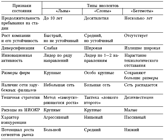 Виоленты работают в «окрестностях» максимума выпуска продукции. Их научно-техническая политика требует принятия решений о сроках постановки продукции на производство (в том числе о приобретении лицензий); о снятии продукции с производства; об инвестициях и расширении производства; о замене парка машин и оборудования. Они должны иметь должность инновационного менеджера и быть очень осторожны в изменении своей политики. Примеры: автомобили «Тойота», «Шевроле», холодильники «Сименс», «Электролюкс», сигареты «Мальборо», «Кэмел» и др. К ним относится большинство крупных российских промышленных предприятий. Патиентная (нишевая) стратегия («Хитрая лиса») типична для фирм, вставших на путь узкой специализации для ограниченного круга потребителей. Свои дорогие и высококачественные товары они адресуют тем, кого не устраивает обычная продукция. Их девиз: «Дорого, зато хорошо». Они стремятся уклониться от прямой конкуренции с ведущими корпорациями. Для отечественных фирм эта стратегия может быть принята в качестве предпринимательской философии. Она призывает не бороться напрямую с ведущими корпорациями, а выискивать недоступные для них сферы деятельности. Такой подход серьезно повышает шансы слабого в соперничестве с сильными. Таким образом, патиенты работают на узкий сегмент рынка и удовлетворяют потребности, сформированные под действием моды, рекламы и других средств. Они действуют на этапах роста выпуска продукции и одновременно на стадии падения изобретательской активности. Требования к качеству и объемам продукции у этих фирм связаны с проблемами завоевания рынков. Возникает необходимость принимать решения о проведении или прекращении разработок, о целесообразности продажи и покупки лицензий и т. п. Эти фирмы прибыльны. В то же время существует вероятность принятия неверного решения, ведущего к кризису. В таких фирмах целесообразна должность постоянного инновационного менеджера, призванного обезопасить их деятельность. Главная цель инновационного менеджера снизить риск в жизнедеятельности фирмы и создать комфортные условия работы для сотрудников. Коммутантная (соединяющая) стратегия («Серая мышь») преобладает при обычном бизнесе в местных (локальных) масштабах. Сила местного неспециализированного предприятия в его лучшей приспособленности к удовлетворению небольших по объему (а нередко и кратковременных) нужд конкретного клиента. Это путь повышения потребительской ценности не за счет сверхвысокого качества (как у патиента), а за счет индивидуализации услуги. «Вы доплачиваете за то, что мы решаем именно Ваши проблемы» лозунг коммутантов. Виоленты и патиенты не всегда могут удовлетворить индивидуальные потребности, тогда на сцену выступают коммутанты, готовые использовать любую возможность для бизнеса. Повышенная гибкость коммутантов позволяет им удерживать свои позиции в конкурентной борьбе. Фирмы-коммутанты действуют на этапе падения цикла выпуска продукции. Их научно-техническая политика требует принятия решений о своевременной постановке продукции на производство, о степени технологической особенности изделий, выпускаемых виолентами, о целесообразных изменениях в них согласно требованиям специфических потребителей. Инновационный менеджер такой фирмы должен хорошо разбираться в специфи
