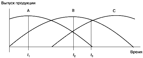 Инновационная стратегия фирмы напрямую зависит от ее научно-технической политики. Согласно современной экономической науке в каждый конкретный период времени конкурентоспособная производственная единица (фирма, предприятие), специализирующаяся на выпуске продукции для удовлетворения определенной общественной потребности, вынуждена работать над товаром, относящимся к трем поколениям техники уходящему, господствующему и нарождающемуся (перспективному). Каждое поколение техники проходит в своем развитии обособленный жизненный цикл. Пусть фирма в отрезок времени от t 1 до t 3 работает над тремя поколениями техники А, В, С, последовательно сменяющими друг друга (рис. 5.11).