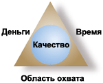 Проектный треугольник ''Сделаем хорошо, быстро, дешево. Выберите из этих трех условий два''. Инженеры уже десятки лет говорят это руководителям проектов.Если сформулировать эту мысль немного иначе, каждый проект представляет собой треугольник, в котором сбалансированы время, деньги и область охвата, — изменить один из факторов, не затронув хотя бы один из других, невозможно. Задача руководителя проекта — следить за тем, чтобы треугольник не распался.Но как? Когда возникает проблема, сначала определите ее место в треугольнике проекта: в чем дело — во времени (расписание), деньгах (бюджет) или области охвата? Во-вторых, выясните, какие стороны треугольника вы можете изменить, а какие зафиксированы. В-третьих, скорректируйте факторы, которые помогут устранить проблему и оптимизировать проект. В-четвертых, сдайте проект и отпразднуйте его завершение! Время + деньги + область охвата = качество Треугольник проекта также называют железным треугольником или, менее поэтично, тройным ограничением. Как его не назови, он сводится к одному: невозможно изменить бюджет, расписание или область охвата проекта, не повлияв по крайней мере на один из других факторов.