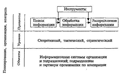 Информация – это сведения об окружающем мире (объектах, явлениях, событиях, процессах и т.д.), которые уменьшают имеющуюся степень неопределенности, неполноты знаний, отчуждены от их создателя и стали сообщениями, которые можно воспринимать путем передачи людьми устным, письменным и другим способом. В зарубежной литературе для обозначения комплекса задач управления, связанных с информационными системами, используют понятие «Information Management». Оно включает как внутренние задачи управления в среде информационных систем, так и вопросы использования для решения разнообразных задач в сфере основной деятельности предприятия. Сфера информационного менеджмента в широком смысле – совокупность всех задач управления на всех этапах жизненного цикла предприятия, включающая все действия и операции, связанные как с информацией во всех ее формах и состояниях, так и с предприятием в целом на основе данной информации. При этом должны решаться задачи определения ценности и эффективности использования не только собственно информации, но и других ресурсов предприятия, в той или иной мере входящих в контакт с информацией: технологических, кадровых. Финансовых и т.д. Информационный менеджмент в узком смысле представляет собой круг задач управления, прежде всего производственного и технологического характера, решение которых обеспечивает достижение целей организации в основной ее деятельности за счет эффективного согласованного управления как элементами, процессами и ресурсами собственно информационной системы, так и другими элементами предприятия. В данных задачах управления в той или иной степени используются информационные системы и реализованные в них информационные технологии (рис. 2).