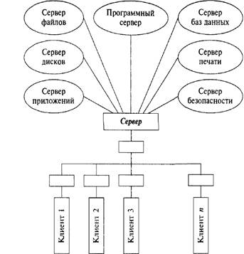 Технологии различаются составом и последовательностью операций, степенью их автоматизации (долей машинного и ручного труда), надежностью их выполнения. Надежность реализуется качеством выполнения основных операций и наличием разнообразного их контроля. Кроме того, организация информационных технологий определяется рядом факторов и критериев. Главные из них – объемы информации, срочность и точность ее обработки, структурные и предметные особенности объекта, управления, соответствие временным регламентам взаимодействия производственных процессов и их элементов. Для удобства проектирования и управления технологические операции объединяют в процедуры или этапы обработки и преобразования, т.е. в более укрупненные элементы технологического процесса. Например, процедура сбора и регистрации первичной информации включает ее доставку, сбор, передачу регистрацию на машинном носителе или бумаге, ввод в систему, контроль ввода. При этом должны быть обеспечены достоверность, полнота и своевременность процедуры. Особенность процедуры в ее низкой степени автоматизации, так как может присутствовать клавиатурный ввод, который отличается большими трудозатратами и ошибками[20]. В управлении технологическими процессами и объектами дискретного и непрерывного действия обработка сигналов, сообщений наиболее употребима для управления на низовом, производственном уровне. Для среднего и верхнего уровней управления предприятием информация обобщается, группируется, агрегируется, чтобы получить более полную и достоверную картину состояния всего производства при принятии управленческих решений. Работа с базами данных наиболее распространенная и эффективнее всего реализуется в конфигурации «клиент-сервер». Клиент-сервер — это модель взаимодействия компьютеров в сети. Как правило, компьютеры в такой конфигурации не являются равноправными. Каждый из них имеет свое, отличное от других, назначение, играет свою роль. Некоторые компьютеры в сети владеют и распоряжаются информационно-вычислительными ресурсами, такими, как процессоры, файловая система, почтовая служба, служба печати, базы данных. Другие же компьютеры имеют возможность обращаться к этим службам, пользуясь услугами первых. Компьютер, управляющий тем или иным ресурсом, принято называть сервером этого ресурса, а компьютер, желающий им воспользоваться — клиентом (рис. 6). Конкретный сервер определяется видом ресурса, которым он владеет. Так, если ресурсом являются базы данных, то речь идет о сервере баз данных, назначение которого — обслуживать запросы клиентов, связанные с обработкой данных в базах; если ресурс — файловая система, то говорят о файловом сервере, или файл-сервере, и т.д. В сети один и тот же компьютер может выполнять роль как клиента, так и сервера (рис. 7). Например, в информационной системе, включающей персональные компьютеры, большую ЭВМ и мини-компьютер, последний может выступать как в качестве сервера базы данных, обслуживая запросы от клиентов — персональных компьютеров, так и в качестве клиента, направляя запросы большой ЭВМ.
