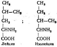 Изолейцин (α-амино-β-метилвалериановая кислота) содержится в белках в небольших количествах. Открыт Ф. Эрлихом в 1904 г. в гидролизате фибрина. Имеет в молекуле два асимметрических атома углерода. Лейцин и изолейцин в тканях животных и человека не синтезируются. Моноаминодикарбоновые кислоты содержат в составе молекулы одну аминную и две карбоксильные группы, в связи с чем проявляют кислотный характер. Аспарагиновая (аминоянтарная) кислота получена из гидролизатов растительных белков в 1868 г. Широко распространена, синтезируется в животных тканях. Играет важную роль в обезвреживании аммиака в организме путем образования амидов, участвует в синтезе мочевины, пиримидиновых оснований и в переаминировании аминокислот.