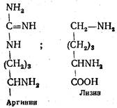 Диаминомонокарбоновые кислоты. В состав белков организма человека и животных входят аминокислоты, содержащие две аминные и одну карбоксильную группы, что обусловливает их основный характер. Аргинин (α-амино-δ-гуанидинвалериановая кислота) впервые получен из гидролизата ростков люпина в 1886 г. Входит в состав почти всех растительных и животных белков. Много аргинина содержится в эмбриональных тканях, опухолях и в белках спермы рыб. Участвует в образовании креатина, важнейшего субстрата мышечной ткани. При гидролизе образует аминокислоту орнитин и мочевину.