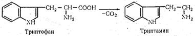 Гетероциклические аминокислоты. Триптофан (α-амино-β-индолилпропионовая кислота) открыт в гидролизате казеина в 1901 г. Входит в состав многих белков в небольшом количестве. В животных тканях не синтезируется. В результате декарбоксилирования триптофана образуется триптамин — регулятор кровяного давления в животном организме: