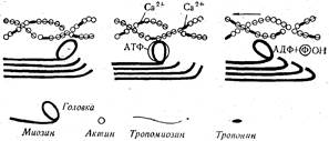 Актин и миозин, соединяясь вместе, образуют актомиозиновый комплекс, который является основным сократительным белком мышечной ткани. Механизм мышечного сокращения выглядит следующим образом. Глобулярная головка миозина присоединяет АТФ и взаимодействует с тонкой нитью актина. Миозин расщепляет АТФ, это приводит к изгибанию головки миозина, в результате чего тонкая нить актина, перемещается, проскальзывая между толстыми волокнами. Затем миозин отделяется от актина, присоединяет новую молекулу АТФ, и процесс повторяется. Таким образом, мышечное сокращение является результатом скольжения тонких нитей актина вдоль толстых волокон миозина. В этом процессе принимают участие ионы Са2+ (рис. 34).