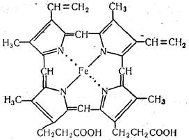 Известна еще одна группа белков — протеиноиды, или склеропротеиды. Эти белки очень прочны и эластичны, не растворяются в воде, растворах кислот, щелочей, солей, не расщепляются ферментами. Входят в состав опорной и покровной тканей (костей, хрящей, сухожилий, волос, кожи) и относятся к фибриллярным белкам. В организме больше всего содержится коллагена, который является основным белковым компонентом кожи, сухожилий, хрящей. Очень интересны физические свойства коллагена. По своей прочности он может сравниться с прочностью стальной проволоки. В составе этого белка содержится повышенное количество глицина (30 % суммы аминокислот), а также оксипролин и оксилизин. Молекула коллагена состоит из трех полипептидных цепей, связанных между собой водородными связями и образующих тройную спираль. При длительном кипячении коллаген превращается в желатин. В крупных артериях содержится другой белок — эластин, также богатый глицином и пролином. Особенностью этого белка является способность к растяжению. В качестве основного белкового компонента волос, ногтей и шерсти является кератин, шелка — фиброин. Протеиды. К группе сложных белков, или протеидов, как указывалось выше, относятся такие, в состав которых кроме белковой части входит какая-либо небелковая, так называемая простетическая, группа, прочно связанная с белком. Все протеиды делят на группы в зависимости от природы их небелковой части. Хромопротеиды — сложные белки, молекулы которых состоят из простого белка и окрашенной простетической группы, откуда и получили свое название (от греч. Урюца — краска). Белковая часть чаще всего представлена гистонами, а простетические группы—различными окрашенными соединениями: витамином В2, каротином, порфирином. Многие хромопротеиды в составе небелковой группы содержат металлы, поэтому их еще называют мет-таллопротеидами. В организме человека и высших животных одним из наиболее важных хромопротеидов является гемоглобин — красный железосодержащий белок, обладающий способностью переносить газы с током крови. При изучении четвертичной структуры белка в качестве примера были рассмотрены структура и порядок размещения полипептидных цепей в молекуле гемоглобина. Теперь более подробно остановимся на строении его небелковой части, называемой гемом. Молекулу гема составляют четыре производных пиррола, которые соединены между собой метановыми группами (—СН=), четыре ме-тильных радикала (—СН3), два винильных радикала (—СН=СН2), два остатка пропионовой кислоты (—СН2СН2СООН) и один атом двухвалентного железа. Строение его выражается следующей формулой;