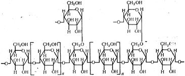 В составе такой цепи насчитывается 200—1000 остатков глюкозы. Молекулярная масса амилозы составляет около 60 тыс. Амилопектин плохо растворим в горячей воде и образует коллоид-ные растворы, которые окрашиваются иодом в красно-фиолетовый цвет. Остатки глюкозы в молекуле амилопектина соединены не только 1,4-, но также и 1,6-гликозидными связями, которыми присоединены боковые цепи. Соотношение связей 1,4 к 1,6 составляет примерно 25: 1. Поэтому молекула амилопектина имеет разветвленную структуру и ее можно представить как клубок полисахаридных цепей без ярко выраженной главной цепи: