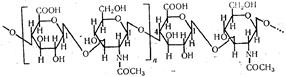 Количество остатков глюкозы в молекуле целлюлозы достигает нескольких тысяч, что соответствует молекулярной массе от 500 тыс. до 20 млн. Отдельные нитевидные молекулы целлюлозы при взаимодействии друг с другом образуют прочные мицеллы, которые, в свою очередь, с помощью водородных связей объединяются в фибриллы. В чистом виде целлюлоза представляет собой волокнистое вещество без запаха и вкуса. В связи со специфическим строением целлюлоза нерастворима в воде, эфире,спирте. В обычных условиях на нее не действуют разбавленные растворы щелочей, кислот ислабых окислителей. Растворяется целлюлоза в реактиве Швейцера (разбавленный раствор Сu(ОН)2 I крепком аммиаке), растворе хлорида цинка в соляной кислоте при нагревании и в концентрированной серной кислоте. Благодаря наличию свободных гидроксильных групп целлюлоза вступает в отдельные реакции с кислотами и спиртами с образованием различных эфиров. Так, при действии азотной кислоты образуется нитроклетчатка, при действии уксусного ангидрида — ацетилклетчатка. С помощью этих реакций из целлюлозы изготовляют целлофан, взрывчатые вещества, фото- и кинопленку и т.д. При гидролизе целлюлозы в присутствии концентрированных кислот образуется β-глюкоза. Организм человека и многих животных не способен переваривать клетчатку. Такой способностью обладают только микроорганизмы, обитающие в пищевом канале травоядных животных, которые питаются и основном клетчаткой. Гликозамингликаны (мукополисахариды) Гликозамингликаны (ГАГ) — это сложные высокомолекулярные гетерополисахариды. Их молекулы построены из остатков различных моносахаридов, их производных и других соединений. Растворы ГАГ и их комплексы с белками — мукопротеиды — имеют слизистый характер, откуда и получили свое название (от лат. mucor — слизь). Наибольшее значение имеют кислые ГАГ: гиалуроновая и хондро-итинсерная кислоты и гепарин. Гиалуроновая кислота. Молекула этого гетерополи-сахарида построена из большого количества остатков глюкуроновой кислоты и N-ацетилглюкозамина в соотношении 1: 1, связанных между собой 1,3-гликозидными связями, т.е. структурной единицей гиа-луроновой кислоты является дисахарид, состоящий из глюкуроновой кислоты и N-ацетилглюкозамина: