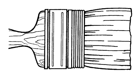 6. Филеночные кисти. По внешнему виду напоминают ручники, но отличаются меньшими размерами. Их используют для окрашивания труднодоступных мест или для декоративного оформления. 7. Торцовки. Торцовки изготавливаются из твердой щетины. При использовании торцовок окрашенная поверхность принимает зернистый вид. Перед началом покрасочных работ новую кисть необходимо намочить в мыльном растворе, для того чтобы волос размягчился и набух. После этого кистью работают на шероховатой поверхности в течение 15 минут. Такая операция помогает выровнять волос и придать кисти рабочую форму. В том случае, если волос слишком длинный, его подвязывают прочной бечевкой у основания рукоятки (рис. 10). Однако длина волоса не должна быть больше 50 мм. Прочность обвязки зависит от красочного раствора, используемого в работе: для масляных кистей обвязку делают туже, чем для клеевых.