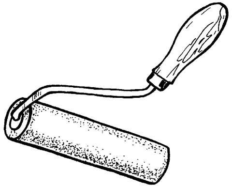 Для временного хранения кистей используют емкости с водой, керосином или скипидаром. Также можно хранить кисть непосредственно в той краске, которой на данный момент проводят покрасочные работы. Нужно только следить за тем, чтобы волос не касался дна. В этих целях в рукоятке кисти просверливают отверстия, через которые продевают шпагат и подвешивают кисть на крючок. По завершении работ кисти необходимо тщательно промыть. Клеевые краски легко удаляются мыльной водой, а масляные – уайт‑спиритом, скипидаром, керосином. После этого волос отжимают тряпочкой и кисть подвешивают. Отработанные кисти со стершимся волосом можно в дальнейшем использовать для размывки побелки или для других работ. Иногда появляется необходимость проводить покра – ску на достаточно большой поверхности. В этом случае как правило используют специальные валики из меха или поролона (рис. 11), которые можно изготовить из овчины или ткани с ворсом длиной не менее 15 мм. Перед началом работы валик обязательно вымачивают в воде.