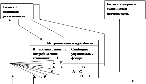3. НИОКР как сфера бизнеса. Возражения против планирования исследований и разработок: - случайный характер возникновения большинства нововведений. Случай играет здесь важную роль. Но ни одна компания не собирается вкладывать средства в развитие науки и техники только на основании веры и надежды. С другой стороны, было бы недальновидно не рассмотреть неожиданное нововведение только потому, что оно не было предусмотрено планом; - дух поиска, присущий исследователям и разработчикам, требует некоторого удовлетворения, в частности, в ходе работы на ранних стадиях цикла; - потребность в индивидуальных исследованиях. Научно-технический работник должен иметь определенную возможность посвятить часть своих усилий работе над проектами, не отвечающими на каком-то этапе потребностям компании. Добиться гибкости системы планирования (чтобы воспринимать некоторую деятельность, не нацеленную непосредственно на четко определенные цели) можно, осознав, что компания, вкладывая средства в развитие техники, по существу вовлечена в два вида деятельности – “два бизнеса” (рис. 10): 1) основную деятельность, определяемую целями организации, связанную с удовлетворение рыночной потребности; 2) неосновную научно-техническую деятельность, результатом которой являются новая техника и технология, имеющие коммерческую ценность, но часто не связанные с целями организации.