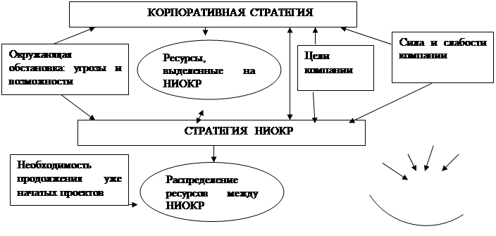 Рис 11. Процесс принятия решений относительно НИОКР. Уровни планирования инноваций: 1) отдельный проект, 2) организация в целом. На первом ведется разработка инновационного проекта – комплексного плана мероприятий, направленных на создание нового или модернизацию действующего производства товаров, работ и услуг. Планирование инноваций на уровне организации в целом реализуется в форме плана инновационного развития, который можно представить как определенную совокупность инновационных проектов, портфель проектов. Инновационные проекты в плане ранжируются по значимости, устанавливается структура и масштабы инвестиций (капитальных вложений) в предстоящем периоде. Главные решения в области планирования инновационной деятельности: отбор проектов и распределение ресурсов. Критерии, по которым осуществляется отбор проектов внутри подразделения НИОКР, это внутренне присущие проекту достоинства, не зависящие от организации, в которой проект будет реализован, безотносительно к его вкладу в общий портфель проектов. Но проекты действительно являются независимыми только тогда, когда доступны неограниченные ресурсы. На практике же фонды НИОКР ограничены, и проекты конкурируют между собой за лабораторное оборудование, исследователей и разработчиков, материалы, эффективное управление. Цель максимизации всего портфеля НИОКР может неожиданно достигаться за счет отказа от проекта, который в других условиях мог бы показаться заманчивым, вследствие такой значительной потребности в каких-то ресурсах, что реализация данного проекта привела бы к ликвидации других проектов, требующих таких же ресурсов. Портфель проектов получает определенные характеристики либо в результате действий, предусмотренных научно-технической политикой компании, либо случайным образом. Составленный с единственной целью максимизации ожидаемой финансовой отдачи от затрат на НИОКР и минимизации встающих на пути проектов препятствий портфель проектов может характеризоваться только фактором, обусловливающим объединение этих проектов. Необходимо принять такое решение, при котором портфель формируется для поддержки целей корпорации, одновременно допуская гибкость для реализации появившейся выдающейся возможности. 2. Факторы, учитываемые при формулировке стратегии НИОКР. При формулировке стратегии учитываются не только стратегические цели компании и те средства, что она может выделить, но и ряд других факторов. Прогнозы экономической обстановки. Главной целью здесь является выяснение того, что компания могла бы предпринять для использования благоприятных возможностей, как ответить на угрозы, вытекающие из будущих изменений экономической обстановки, исключить неожиданности и найти новые конкурирующие технологии в сфере бизнеса; Сравнительная эффективность затрат на новую технику. Когда исследования обеспечивают новые знания, коммерческая польза которых столь незначительна, что ею можно пренебречь, тогда гораздо больше возможности открывают вложения в новую отрасль технологии, в новый технический принцип. Риск против окупаемости. Различным стратегиям НИОКР присущ различный риск. Он реализуется через совокупность проектов, каждый из которых ассоциируется со своим уровнем риска. Количественно оценить риск можно при помощи планировани
