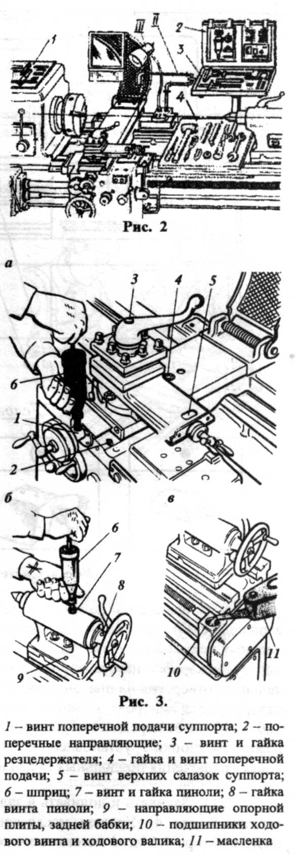 2.5.Нужный в работе инструмент (ключи, отвёртки и т. д.) должен находиться на верхней наклонной полке тумбочки на специальных штырях. 2..6. Заднюю бабку, систему охлаждения II и электролампочку III (рис. 2) установить в исходное положение. 2.7. Протереть станок, смазать места трения и направляющие станины с помощью масленки 11 (рис. 3, в) и специального шприца 6а Рис. 2 (рис. 3, а, б).