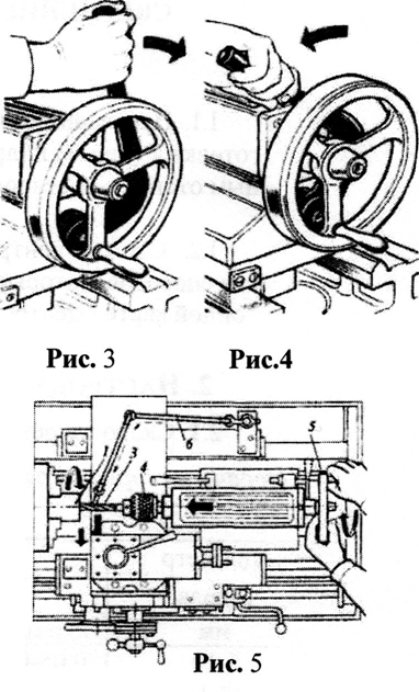 3.5. Зафиксировать положение задней бабки на станине с помощью рукоятки от себя (рис. 3), открепить можно поворотом рукоятки на себя (рис. 4). 3.6. Подавать сверло 3 с пинолью 4 вращением маховика 5 задней бабки (рис. 5). В процессе сверления сверло охлаждать смазывающе-охлаждающей жидкостью, подаваемой по гидроприводу 6 станка. 3.7. Постепенно увеличивая величину подачи, довести до табличной величины. 3.8. Периодически нужно выводить сверло из отверстия заготовки, чтобы удалить накопившуюся в спиральных канавках стружку металлическим крючком. 3.9. В конце сверления подачу сверла уменьшить до минимальной, так как при выходе вершины сверла возможно её заклинивание. 3.10. Вывести сверло из отверстия и возвратить заднюю бабку в исходное положение. 3.11.Выключить смазывающе-охлаждающую жидкость. Date: 2015-09-23; view: 815; Нарушение авторских прав |