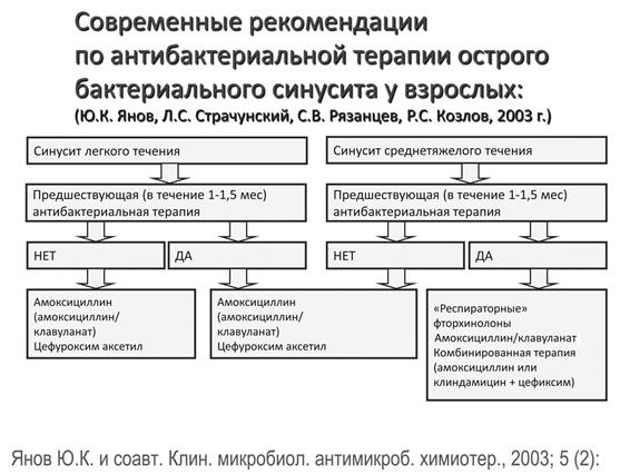 Во многих случаях необходимо учитывать территориальную резистентность ведущих возбудителей. Необходимо помнить, что H. influenzae, а также M. catarrhalis являются активными продуцентами β-лактамаз, что диктует необходимость использования в качестве препаратов стартовой терапии защищенных аминопенициллинов. При первично возникшем синусите возможно начинать терапию с незащищенных форм аминопенициллинов. Именно поэтому аминопенициллины являются стандартом терапии острой гнойно-воспалительной патологии ЛОР-органов. Помимо этого существует возможность использования современных макролидов. Макролиды являются препаратами выбора при непереносимости β-лактамов, а также с успехом используются в лечении данной патологии для воздействия на внутриклеточные и атипичные формы бактерий. Помимо этого при остром гнойном синусите и остром гнойном среднем отите возможно назначение пероральных форм цефалоспоринов II–III поколений, а также, фторхинолонов III–IV поколений. Фторхинолонам следует отдавать предпочтения в случаях тяжелого течения инфекции при наличии клинической картины полисинусита, а также анамнестических данных о приеме других групп антибактериальных препаратов в предшествующие 3 месяца или непереносимости других групп антибтотиков. Главным побочным эффектом фторхинолонов III–IV поколения является их негативное действие на растущую соединительную и хрящевую ткань, поэтому эти препараты противопоказаны детям и подросткам. При тяжелом течении острого риносинусита предпочтителен внутримышечный и внутривенный путь введения, целесообразно назначение цефалоспоринов: цефотаксима или цефтриаксона. При внутривенном введении используются амоксициллин/клавуланат и цефалоспорины. В случае риска анаэробной инфекции – возможно назначение клиндамицина в комбинации с цефалоспоринами (рис. 2).