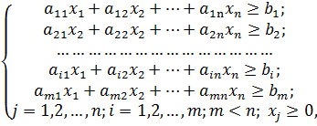 Получается, что величина aij это количество i-го элемента, присутствующего в единице веса j-го продукта. Матрица Вектор решения для рациона питания должен показать, какое количество xi i-го продукта должно содержаться в меню«исследуемого» животного за день (месяц, квартал, год). Он означает, что за определенный промежуток времени животное должно быть обеспеченоx1единиц первого продукта, x2 единиц второго, …, xn единиц n-го продукта. Какие же требования могут быть предъявлены к рациону? Выполнение конкретных медицинских требований. Они состоят в том, что за определенный срок животное должно получить не менее необходимого количества каждого элемента. Обозначим через bj, то минимально необходимое количество j-го элемента, которое должно получить животное. В таком случае, рацион питания должен соответствовать полученным ограничениям (2.1).