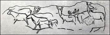 Лишь к концу периода художники начинают группировать фигуры животных. К лучшим памятникам такого характера относится изображение табуна лошадей на стене пещеры Лимейль (Франция), рисунок на кости стада оленей из грота Мэри около Тейжа (Франция) и табун лошадей из грота Шаффо (Франция).