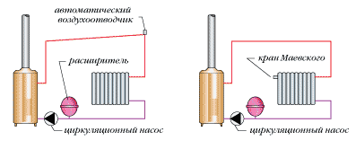 рис. 8. Принципиальные схемы систем отопления с насосной циркуляцией и расширительным бачком закрытого типа Однако при такой схеме системы отопления мы сталкиваемся с двумя проблемами: удалением воздуха и повышенным давлением на котле. Если в системах с открытыми расширительными бачками воздух удалялся через расширитель противотоком (в системах с естественной циркуляцией) или попутно (в системах с насосной циркуляцией), то с закрытыми бачками такого не происходит. Система полностью замкнута и воздуху попросту негде вырваться наружу. Для удаления воздушных пробок в верхней точке трубопровода устанавливаются автоматические спускники воздуха — приборы, снабженные оплавками и запорными клапанами. По мере увеличения давления клапан срабатывает и стравливает воздух в атмосферу. Либо на каждый радиатор отопления устанавливаются краны Маевского. Эта деталь, установленная на отопительные приборы, позволяет спускать воздушную пробку непосредственно из радиаторов. Кран Маевского входит в комплект некоторых моделей радиаторов, но чаще предлагается отдельно.