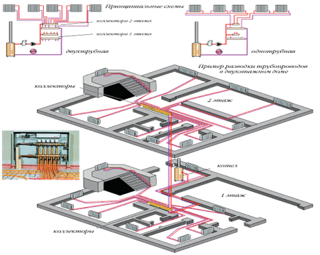 рис. 16. Коллекторы Коллекторные схемы отопления чаще всего выполняются для двух- и однотрубных горизонтальных разводок и на сегодняшний день практически вытеснили тройниковые горизонтальные разводки.