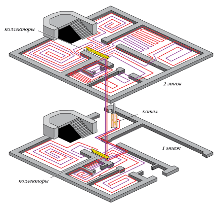 рис. 18. Коллекторная система отопления «теплый пол» Напольное отопление обеспечивает комфортные условия — тепловые потоки распределены по всей площади полов, а температура равномерно понижается по высоте помещения. При радиаторном отоплении температура воздуха, наоборот, повышается по высоте помещения, что вызывает сильную конвекцию воздуха, которая отрывает от поверхности пола пыль и поднимает ее вверх. При напольном отоплении естественное перемещение воздуха ограничено, в связи с чем пыли в доме будет меньше.