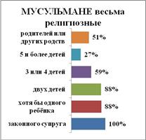 Рисунок 2. Среди женщин, также как и среди мужчин, представители группы A гораздо чаще, чем представители группы B, считают достаточными основаниями для развода не только объективные причины (то есть, неправильное поведение супруга), но и субъективные обстоятельства. 67% женщин из группы A и 34% — из группы B считают уважительной причиной для развода то, что жена разлюбила мужа. Еще чаще, чем утрата любви, признается серьезнейшей причиной для развода изначальное отсутствие этого чувства у жены. 83% женщин из группы A и 46% представительниц группы B считают, что жена вправе требовать развода с мужем лишь потому, что вышла за него не по любви и потом так и не полюбила его. Здесь не указано, есть ли у женщины, которая разлюбила (или никогда не любила) мужа, любимый человек, к которому она может уйти. Если же речь идет о том, что «жена полюбила другого и может создать с ним новую семью», то в этом случае оправдывают развод почти все женщины из группы A (92%) и две трети женщин из группы B (64%). Разумеется, мужья далеко не всегда виноваты в том, что жены их разлюбили или никогда не любили либо просто влюбились в других мужчин. По мнению известного английского писателя Сомерсета Моэма, который был прекрасным знатоком психологии межличностных отношений: «…в любви есть милосердие, желание защитить любимое существо, стремление сделать добро, обрадовать, — если это и не самоотречение, то, во всяком случае, удивительно хорошо замаскированный эгоизм» [14]. Однако, если любовь проходит или обращается на другого человека, то в отношении супруга, которого разлюбили или никогда не любили, этот эгоизм проявляется в неприкрытом виде. Инициатор развода, для которого любовь все оправдывает, причиняет много зла покинутому супругу и детям без каких-либо угрызений совести. Но сама любовь, хотя очень многие люди считают ее единственно возможной основой для брака и семьи, принадлежит к числу индивидуалистических, а не фамилистических ценностей. Высокая ценность личной свободы не всегда сильно повышает долю сторонников развода. Ни у мужчин, ни у женщин нет статистически значимых различий между мнениями представителей первой и второй групп относительно таких причин развода как бесплодие, постоянные супружеские измены, пьянство, побои, гомосексуализм, лесбиянство и некоторые другие, как правило, объективные, обстоятельства. Объем статьи не позволяет прокомментировать ответы на все вопросы анкеты, но данные, приведенные в рисунках 1 и 2, говорят сами за себя. Данные исследования «Религия, семья, дети», проведенного кафедрой социологии семьи и демографии в 2003—2006 гг., показали, что, несмотря на широкую распространенность сожительств («гражданских браков»), почти у всех опрошенных (93%) семейный образ жизни в большой или очень большой степени ассоциируется с наличием законного супруга. По этому параметру не было больших различий между разными группами респондентами разных вероисповеданий (христиане, мусульмане, иудеи). Ответы на данный вопрос мало зависели и от степени религиозности. Как весьма религиозные, так и не слишком религиозные и вообще не религиозные люди в большой и очень большой степени ассоциируют семейный образ жизни с наличием законного супруга. Среди весьма религиозных христиан этого мнения придерживаются 98%, а среди весьма религиозных мусульман — все 100%, то 