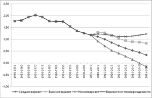 Рисунок 3. График динамики суммарной рождаемости в России весьма схож с кривыми идеального, желаемого и ожидаемого числа детей в последние годы. Это означает, что фактическая рождаемость детерминируется репродуктивными установками, т. е. показателями предпочитаемого числа детей.