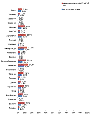 Рисунок 2. Рассчитано по базе данных Европейского социального исследования, Последствия депопуляции уже сегодня ощущаются повсеместно. Постарение населения обостряет проблему пенсионного обеспечения, в связи с этим во многих странах обсуждается проблема повышения возраста выхода на пенсию. В свою очередь, сокращение трудоспособного населения затрудняет возможность пенсионных выплат. Сколь остра эта ситуация видно по октябрьским забастовкам во Франции в связи с решением парламента об увеличении возраста выхода на пенсию с 60 до 62 лет. По среднему варианту прогноза ООН к 2050 г. трудоспособный контингент в Европе сокращается на 10%, тогда как доля пенсионеров старше 60 лет увеличивается с 22% до 34%. В Германии, депопулирующей уже 30 лет доля трудоспособных к 2050 г. уменьшается с 60,8% до 47,9%, при этом доля пенсионеров увеличивается до 39,5%, превышая долю детей более чем в три раза. В США прогнозируется 35,2% людей пенсионного возраста и 17,1% детей к 2050 г., хотя сегодня пожилых больше лишь на 1,4%. Однако в США на 13 лет выше ожидаемая при рождении продолжительность жизни, чем в России и выше почти на 0,5 суммарный коэффициент рождаемости, и, тем не менее, американские ученые предупреждают, что уменьшающиеся когорты детей и внуков нынешних граждан будут нести бремя «регенерирования человеческого капитала», необходимого для эффективной экономики. Но экономика не может расти, если уменьшается и стареет само население. К тому же к 2050 г. американцев, бывших гражданами США в 1970 г. (и их потомков) станет в несколько раз меньше по сравнению с теми, кто иммигрировал в США после 1970 г. В России, депопулирующей с 1992 г., доля трудоспособных ресурсов уменьшается с 67,4% до 52,1% при росте людей старше 60 лет с 17,8% до 31,7%. Но доля старых людей может оказаться еще больше, если в ближайшие несколько лет не будет радикально усилена демографическая политика. Дело в том, что после 2010 года прекращается влияние в 2007—2009 гг. временного улучшения условий реализации потребности в детях (вызванное «Концепцией демографической политики», принятой в 2007 г.), а также угасает компенсационное воздействие демографической структуры, или другими словами, «демографической волны» 80-х гг. Поэтому, продолжающееся снижение интенсивности рождаемости приведет вновь к ежегодной убыли населения в 700 тыс. чел. и более. При вполне вероятном снижении в 2015—2025 гг. суммарного коэффициента рождаемости до 1,0 (если учесть весьма низкие репродуктивные установки новых поколений, рожденных на рубеже веков) ежегодная убыль может составить 1 млн.чел. и тогда население страны (при условии отказа от политики увеличения многодетных семей и нереальности перспективы иммиграционной компенсации этой убыли) может сократиться до 100 -110 млн. где-то в 40-е годы. В обострении современной демографической ситуации в России главную роль играет сокращение рождаемости до очень низкого уровня. Однако, в отличие от европейских стран, характеризующихся низкими уровнями общей и младенческой смертности, в нашей стране показатели смертности остаются весьма высокими. Превышение уровня смертности над уровнем рождаемости, ведущее к убыли населения, заставляет многих чисто психологически интерпретировать депопуляцию буквально как вымирание. Но депопуляция как процесс суженного воспроизводства поколений (поколение матерей замещается