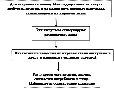 Здесь тоже два режима. Один способствует поддержанию веса на постоянном уровне. Второй, более активный и тонизирующий, способствует снижению веса. Не будем забывать, что не менее 80% жира сгорает именно в мышцах. Чем лучше мышцы сориентированы на расщеление жира, тем легче нам худеется. Кстати, жир в мышцах расходуется не только при физической нагрузке, но и в покое. Уровень этого расхода зависит от тонуса, так называемого мышечного сокращения готовности. Смотрите, какая интересная возникает здесь цепь событий: