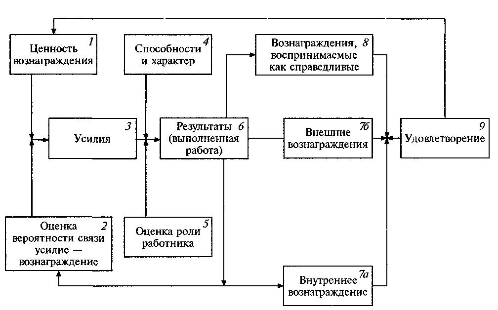 Теория мотивации Герцберга имеет много общего с теорией Маслоу. Его мотивации сравнимы с потребностями высшего уровня по Маслоу. Процессуальные теории мотивации. В рамках процессуальных теорий анализируется то, как человек распределяет свои усилия для достижения конкретных целей и как он выбирает конкретный вид поведения. Процессуальные теории не оспаривают существования потребностей, но считают, что поведение людей определяется не только ими, но и социальными мотивами. Существуют три основные процессуальные теории мотивации: теория ожиданий, теория справедливости и модель Портера — Лоулера. В идеале основная мысль теории ожиданий состоит в надежде человека на то, что выбранный им тип поведения приведет к удовлетворению желаемого. Ожидание — оценка личностью вероятности определенного события. Теория ожидания подчеркивает важность трех взаимосвязей: затрат труда — результатов; результатов — вознаграждения; вознаграждения — валентности (удовлетворенности вознаграждением). Люди по-разному распределяют и направляют свои усилия на достижение поставленных целей. Последователи теории справедливости утверждают, что люди субъективно определяют соотношение полученного вознаграждения и затраченных ими усилий: они сравнивают свой заработок с вознаграждением других людей, выполняющих аналогичную работу. Если это сравнение указывает на несправедливость в распределении вознаграждения за труд, то у человека возникает психологическое напряжение. В этом случае необходимо мотивировать данного работника, снять его напряжение и для восстановления справедливости исправить дисбаланс. Это можно сделать, изменив уровень затрачиваемых им усилий либо размер получаемого им вознаграждения. Таким образом, те сотрудники, которые считают, что им не доплачивают по сравнению с другими, могут работать менее интенсивно либо стремятся повысить свое вознаграждение. Те же сотрудники, которые считают, что им переплачивают, будут стремиться поддерживать интенсивность труда на прежнем уровне либо увеличивать ее. Основной вывод теории справедливости в практике управления заключается в том, что до тех пор, пока люди не начнут считать, что получают справедливое вознаграждение, они будут стремиться уменьшать интенсивность своего труда. Менеджеру, однако, следует иметь в виду, что оценка справедливости носит относительный, а не абсолютный характер: все зависит от чувства личного «я» Лайман Портер и Эдвард Лоулер разработали комплексную процессуальную теорию мотивации, включающую элементы теории ожидания и теории справедливости (модель Портера-Лоулера), т.е. в их модели (рис.3.5) фигурирует пять переменных: затраченные усилия, восприятие, полученные результаты, вознаграждение, степень удовлетворения. Согласно модели Портера — Лоулера, результаты, достигнутые сотрудником, зависят от приложенных им усилий (З)1, способностей и характерных особенностей (4), а также от осознания им своей роли в процессе труда (5). Уровень затрачиваемых усилий в свою очередь зависит от ценности вознаграждения (1), а также от того, насколько человек верит в существование прочной связи между затратами усилий и возможным вознаграждением (2). Достижение требуемого уровня результативности (6) может повлечь как внутренние (7а — чувство удовлетворения, самоуважение и т