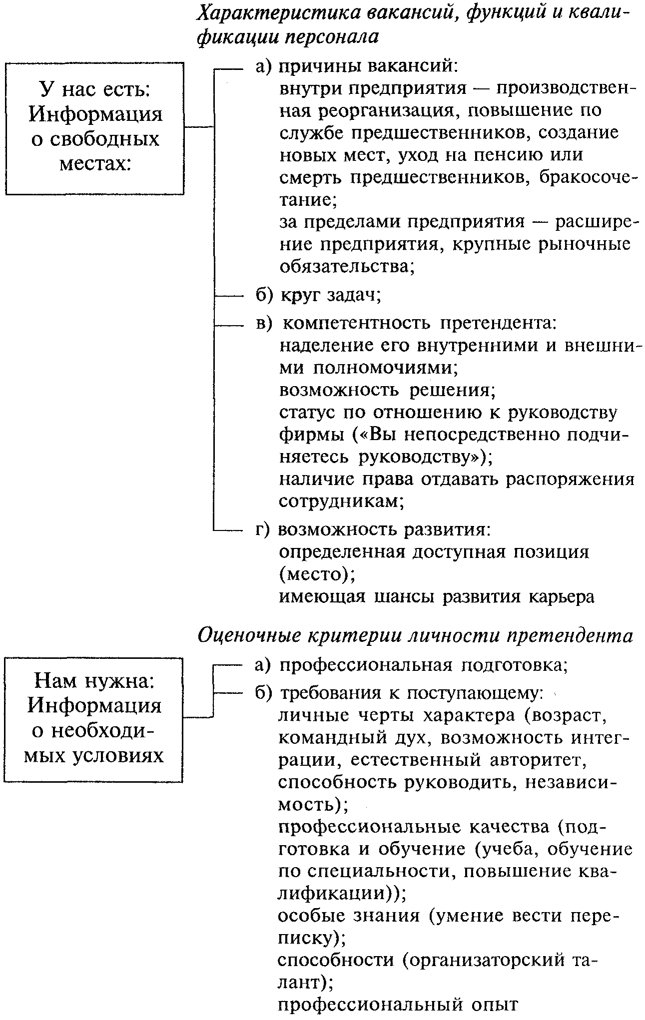Когда разработан план функционирования фирмы, составной частью которого является план трудовых ресурсов, наступает время для выполнения важнейшей работы менеджера — подбора персонала. Суть этого процесса состоит в том, чтобы с учетом требований к кандидату на имеющуюся вакансию привлечь более или менее подходящих квалифицированных работников для последующей их оценки и приема на работу. Значимость этой работы очевидна. Вместе с тем в преобладающем большинстве случаев работника подбирают по интуиции, по совету знакомых, по направлению бюро по трудоустройству и занятости, по внешним признакам, используя метод «проб и ошибок» (слабый работник, как правило, «зависает» в организации и очень сложно в последующем от него избавиться). Отсутствие апробированных методик подбора кадров приводит к ситуации, когда менеджер считает: пусть лучше место пустует, чем будет занято неподходящим работником. В этом смысле важно установить соответствие работника занимаемой должности, т.е. четко выделить виды работ и под эти работы подобрать людей, имеющих нужную для качественного выполнения функциональных обязанностей квалификацию. Эта работа может быть эффективной только в том случае, если она основана на правильной оценке качеств кандидатов, необходимых для конкретного вида деятельности.