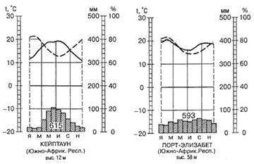 Рис. 121 и 122. Годовой ход температур, осадков и относительной влажности на юго-западе (слева, рис. 121) и юго-востоке (справа, рис. 122) Африки Дожди начинаются в апреле и особенно обильными бывают с июня по сентябрь, а затем прекращаются, так как влажные западные ветры отступают к югу. Конец влажного сезона в Капской области примерно совпадает с началом его в остальных частях Южной Африки. Количество осадков почти нигде не превышает 750 мм в год, и только западные склоны наиболее высоких хребтов получают свыше 1000 мм. Климат на западно средиземноморского типа с зимними осадками (на наветренных склонах свыше 600 мм), на востоке. Осадки более равномерны (свыше 800 мм в год). Зимой на вершинах выпадает снег. Подветренные склоны и внутренние долины полупустынны. На наветренных склонах на запада — главным образом вторичные заросли вечнозелёных кустарников (финбош), на В. — смешанные хвойно-лиственные леса на коричневых и горно-лесных бурых почвах. Природные воды. Внутренние впадины, особенно Малое Кару, очень сухи (150-300 мм в год) и непригодны для земледелия. Даже прибрежная равнина на востоке получает не более 400 мм и нуждается в искусственном орошении (рис. 122). Растительность. Капская горная страна отличается от остальной Южной Африки не только режимом осадков, но и распространением своеобразной, так называемой капской флоры, которая по внешнему облику напоминает средиземноморскую. В этом районе преобладают заросли кустарников с мелкой серовато- и голубовато-зеленой листвой из семейства вересковых, протейных и рутовых. Изредка, особенно на склонах, обращенных к океану, встречаются небольшие массивы редких лесов из сосен и диких плодовых деревьев. Обширные площади между участками кустарников и лесов покрыты травами с преобладанием луковичных, клубненосных и корневищных форм из семейств амариллисовых, ирисовых, орхидных и губоцветных. Характерны также бессмертники, цинерарии и другие сложноцветные. Отсюда по всему миру распространились разнообразные декоративные растения. Из Европы ввезены многие культурные растения: злаки, виноградная лоза, маслины, инжир, яблони, груши и др. Население и экологические проблемы. В настоящее время естественная растительность, в особенности лесная, на обширных площадях уступила место сельскохозяйственным культурам. Date: 2015-09-23; view: 923; Нарушение авторских прав |