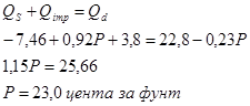 Предложения сахара в США характеризуется кривой QS= -7,46+0,92Р, а спроса Qd=22,8-0,23Р Мировая цена составляет 12,5 цента за фунт. Импорт в США ограничен уровнем 3,8 млрд. фунтов. Определить цены на сахар.