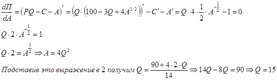 Предельная выручка равна MR=100-6Q+4A1/2 Предельные издержки равны MC=8Q+10 Максимум прибыли достигается MR=MC