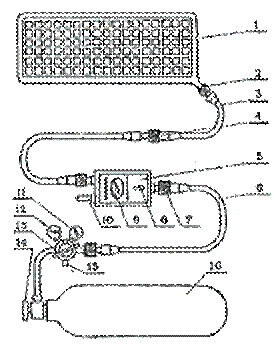 Примечание: 1 – пневмоподушка 2 – разъем цанговый 3 – соединительный рукав 4 – разъем цанговый 5 – пульт управления с трехпозиционным пневмораспределителем 6 – соединительный рукав 7 – разъем цанговый 8 – тумблер 9 – манометр контроля давления в пневмоподушке 10 – клапан предохранительный 11 – манометр низкого давления 12 – манометр высокого давления 13 – редуктор воздушный 14 – вентиль 15 – клапан предохранительный 16 – баллон
