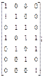 3. Определяем необходимое количество ортогональных проверочных уравнений, исходя из корректирующей способности кода, а именно tисп ≤ (d0-1)/2=(3-1)/2=1 двоичный символ. Так как код корректирует одиночные ошибки, то достаточно сформировать μ=2∙tисп+1=2∙1+1=3 проверочных уравнения и дополнительно ввести тривиальное проверочное уравнение. Таким образом, необходимо сформировать четыре проверочных уравнения; μ'=μ+1. 4. Определяем необходимое количество раздельных проверочных подматриц, используя следующее равенство N=μ'-1=4-1=3. 5. Строим подматрицы раздельных проверок, которые обозначим как q1,1(x), q2,1(x), q3,1(x). Первые (левые) столбцы данных подматриц записываются соответственно с использованием трех столбцов проверочной матрицы (3.4). Вторые столбцы данных подматриц записываются путем циклического сдвига вверх на один такт двоичных символов первых столбцов. Двоичные символы третьих столбцов данных подматриц формируются следующим образом: для первой подматрицы – путем суммирования по модулю два двоичных символов первого, второго и третьего столбцов матрицы (3.4); для второй подматрицы – путем суммирования по модулю два двоичных символов второго, третьего и четвертого столбцов матрицы (3.4); для третьей подматрицы – путем суммирования по модулю два двоичных символов первого, второго и четвертого столбцов матрицы (3.4). Таким образом, раздельные проверочные подматрицы будут иметь следующую структуру: