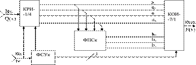 Рисунок 3.10 – Функциональная схема кодера с синдромным алгоритмом кодирования Синтез функциональной схемы декодера выполняем по следующей методике: блоки декодера, реализующие одинаковые функции с блоками кодера, выполняем по аналогичным принципам их построения. Такими блоками декодера являются: КРИ-1/4, КОИ-1/4, ФПСд, ФСУд. ФСС и КО выполняются в виде совокупности сумматоров по модулю два; АС выполняется в виде четырех дешифраторов (ДШ1…ДШ4), настраиваемые соответственно на комбинации синдрома: 011(ДШ1); 101(ДШ2); 110(ДШ3); 111(ДШ4). Функциональная схема декодера, реализующего синдромный алгоритм декодирования приведена на рисунке 3.11.