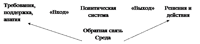 Решения передаются как информационный сигнал в среду. Обратная связь между «входом» и «выходом» осуществляется через окружающую среду. Это так называемая «петля обратной связи». На «вход» в политическую систему подаются импульсы различного рода. Во-первых, это требования. Требования направляются в адрес властей и служат сигналом о наличии в обществе определенных потребностей.