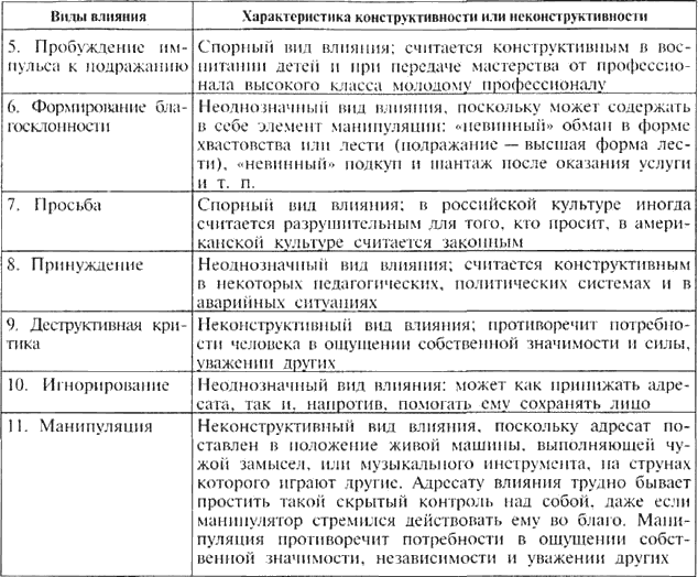 Попробуйте использовать дословное повторение и перефразирование в беседе со знакомыми или незнакомыми людьми. Попробуйте определить, в каких случаях более эффективен первый метод и в каких – второй. Установите, какой из методов в большей степени подходит именно вам. Резюме Общение – это процесс взаимодействия между людьми, в ходе которого возникают, проявляются и формируются межличностные отношения. Общение предполагает обмен мыслями, чувствами, переживаниями и попытками взаимного влияния. Функции общения многообразны: оно является решающим условием становления каждого человека как личности, осуществления личностных целей и удовлетворения важнейших потребностей; оно составляет внутренний механизм совместной деятельности людей и является важнейшим источником информации для человека. В процессе межличностного общения люди сознательно или неосознанно влияют на психическое состояние, чувства, мысли и поступки друг друга. Целью влияния является реализация человеком своих личностных потребностей, таких как потребность в уважении, одобрении, любви, принадлежности к группе, общественном признании, независимости, психологическом комфорте и др. Многие из этих потребностей не могут быть удовлетворены без помощи или вне участия других людей. В процессе влияния эффективно используются различные психологические средства: вербальные, паралингвистические или невербальные. Однако не всякое влияние будет конструктивным для обоих участников взаимодействия, т. е. удовлетворяющим личностные потребности обоих и, по крайней мере, не противоречащим им. Такие виды влияния, как убеждение и самопродвижение, могут рассматриваться в большинстве случаев как конструктивные; деструктивная критика и манипуляция – как разрушительные; внушение, заражение, стимуляция к подражанию, формирование благосклонности, просьба, принуждение и игнорирование – как неоднозначные. Их конструктивность зависит от конкретных целей влияния, ситуации и особенностей исполнения. В процессе общения каждый человек испытывает свои индивидуальные трудности. Вместе с тем некоторых общих затруднений можно избежать, если систематически использовать методы ведения беседы, ежедневно тренируя свои практические навыки в их использовании. «Малый» разговор и искусство задавать вопросы могут помочь вам разговорить собеседника, методы дословного воспроизведения его высказываний и перефразирования – понять его. Ответ на задание 3 (табл. 10). Таблица 10