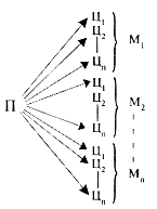 Рис. 1.1. Соотношение потребности с мотивами и целями В приведенной схеме каждый блок целей, направленных на один и тот же мотив, представляет собой возможные варианты одной и той же деятельности (состоящие из соответствующих целям действий), а совокупность этих блоков - возможные варианты различных деятельностей по удовлетворению данной потребности. А.Н. Леонтьев обращал внимание на то, что «сколько-нибудь развернутая деятельность предполагает достижение ряда конкретных целей, из числа которых некоторые связаны между собой жесткой последовательностью. Иначе говоря, деятельность обычно осуществляется некоторой совокупностью действий, подчиняющихся частным целям, которые могут выделяться из общей цели». Последовательность связанных между собой действий отмечается уже в деятельности наиболее высокоразвитых животных, при решении так называемых «двухфазных задач». Например, вне клетки, в которой находится шимпанзе, лежит приманка, а немного ближе — палка, которой можно пододвинуть приманку к клетке. В клетке имеется короткая палка, которой нельзя дотянуться до приманки, но можно достать длинную палку. Обезьяна без труда решает задачу: вначале достает длинную палку, а затем с ее помощью — приманку. Человекообразные обезьяны способны также выбирать наиболее целесообразные цели и действия, ведущие к достижению предмета потребности. Один из курьезных случаев, когда обезьяна выбрала из двух возможных последовательностей действий наиболее выгодный для нее вариант, описан К. Лоренцом: «Профессор Вольфганг Кёлер, чьи исследования интеллекта шимпанзе принесли ему мировую известность, как-то поставил перед молодым самцом-шимпанзе классическую задачу с подвешенной к потолку гроздью бананов, которую обезьяне полагалось достать, придвинув под бананы стоящий в углу ящик. Шимпанзе осмотрелся, потом повернулся не к ящику, а к профессору и схватил его за руку. Надо сказать, что мимика и жесты шимпанзе на редкость выразительны. Желая позвать куда-нибудь другого шимпанзе или человека, который пользуется их расположением, они испускают пронзительные звуки и тянут его за руку. Прибегнув к этому методу, молодой шимпанзе повел профессора Кёлера в противоположный угол комнаты. Профессор подчинился настояниям животного, потому что хотел узнать, чем оно так заинтересовалось. Он не заметил, что его ведут прямо к бананам, и разгадал истинное намерение шимпанзе, только когда тот вскарабкался по нему, точно по древесному стволу, энергично оттолкнулся от его лысины, схватил бананы и был таков. Шимпанзе решил задачу новым и более остроумным способом». Деятельность человека, обычно несравненно более сложная, чем деятельность животных, нередко содержит множество связанных между собой действий, направляемых соответствующим количеством целей. Схематически структура такой сложной деятельности в ее различных вариантах может быть представлена на рис. 1.2.