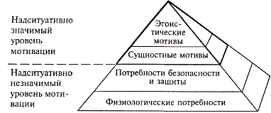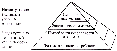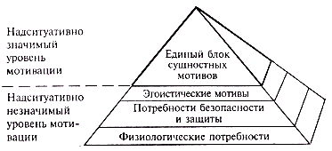 Рис. 1.9. Иерархия потребностей (по А. Маслоу) Самый низший (и самый значимый) базовый уровень составляют физиологические (органические) потребности. От их удовлетворения зависит физическое выживание. К ним относятся потребности в кислороде, сне, пище и питье, нормальной (для физического выживания) температуре, отдыхе при высоких физических нагрузках и т.п. Если та или иная физиологическая потребность не удовлетворяется, то она становится доминирующей и все потребности вышележащих уровней перестают быть значимыми, отходят на задний план. Согласно А. Маслоу, хронически голодный человек неспособен к творческой деятельности, отношениям привязанности и любви, стремлению к карьере и т.д. Следующий от основания пирамиды уровень включает потребности безопасности и защиты, связанные с долговременным выживанием. Это потребности в защите от стихийных бедствий, от хаоса и беспорядков, от болезней; потребности в законности, в стабильности жизни и т.п. Не являясь собственно биологическими, они тем не менее примыкают к самому нижнему базовому уровню мотивации, будучи в целом близким аналогом инстинктивной потребности самосохранения у животных. Эти потребности становятся актуальны тогда, когда достаточно удовлетворены и отходят на задний план физиологические потребности. Третий уровень мотивации представлен потребностями принадлежности и любви. Они проявляются при удовлетворении потребностей двух предыдущих уровней. Человеку необходимы отношения привязанности и любви с членами своей семьи (отношения супругов, родителей и детей, братьев и сестер и т.д.), отношения дружбы, духовной близости, в том числе в группе (с товарищами по интересам и коллегами по работе и т.д.). Кроме того, он нуждается в привязанности к отчему дому, месту, где вырос, и т.п. Эти потребности, выделенные А. Маслоу как особый уровень мотивации, перекликаются с понятием психосоциальной тождественности в концепции Э. Эриксона. Как и психосоциальная тождественность, реализация потребностей данного уровня является, согласно А. Маслоу, основной предпосылкой психического здоровья. При достаточном удовлетворении потребностей в принадлежности и любви их актуальность снижается и возникает следующий, четвертый уровень мотивации — проявляются потребности в уважении и самоуважении. Потребности в самоуважении направлены на обретение уверенности в себе, на достижения, свободу и независимость, компетентность. Потребности в уважении (другими людьми) связаны с мотивами престижа, статуса, репутации, признания, славы, оценки. Удовлетворение потребностей этого уровня порождает чувство собственного достоинства, осознание своей полезности и необходимости. Неудовлетворение ведет к пассивности, зависимости, низкой самооценке, чувству неполноценности. При достаточной степени удовлетворения потребностей четырех перечисленных уровней возникает потребность в самоактуализации. А. Маслоу понимает ее как «стремление человека к самовоплощению, к актуализации заложенных в нем потенций. Это стремление можно назвать стремлением... к идентичности». Человек испытывает «неудовлетворенность оттого, что он занимается совсем не тем, к чему предрасположен. Ясно, что музыкант должен заниматься музыкой, художник — писать картины, а поэт — сочинять стихи, если, конечно, они хотят жить в мире