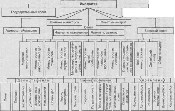 По форме правление Россия до начала XX в. продолжала оставаться абсолютной монархией (см. схему 42). Но в системе организации государственной власти произошли изменения либерального характера, открывшие возможность ненасильственного перехода к демократическому индустриальному обществу. Это отмена крепостного права, судебная, земская и городская реформы. Середина XIX в. характеризуется дальнейшим углублением кризиса феодально-крепостнической системы. В экономической области — промышленный переворот, широкое внедрение машинного производства, строительство железных дорог, пароходов в речном транспорте. Все это требовало более широкого использования наемной рабочей силы. Крепостное право серьезно мешало этому процессу. Тормозило оно и развитие сельского хозяйства, которое снижало свою продуктивность. Экономическая отсталость России особенно наглядно проявилась в Крымской войне, в которой Россия потерпела поражение, углублялся финансовый кризис. Экономические причины дополнялись социально-политическими: в стране неуклонно возрастала социальная напряженность. В результате царское правительство осознало необходимость проведения коренных реформ. Схе м а 4 Высшие и центральные государственные органы в России во второй половине XIX в.