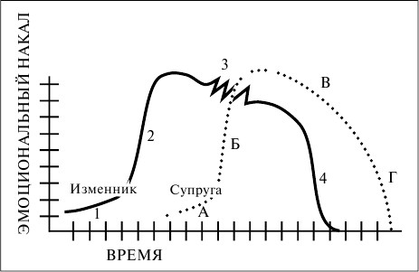На графике, расположенном ниже, изображен процесс выздоровления. Изучите его внимательно. В ходе реабилитации допустимы остановки дня отдыха после кропотливого труда, если вы того пожелаете. Отложите на некоторое время ваш разбор и попытайтесь насладиться передышкой. Мы кратко обсудим каждый отрезок, а затем детально разберем кривую изменника в этой главе, а кривую супруги – в следующей. Чем лучше вы запомните эти графики, тем легче вам будет понять этот сложный процесс. Сейчас будет уместно сделать несколько общих замечаний относительно обеих кривых. Сначала идет кривая изменника, которая делится на четыре фазы: Фаза 1 – возрастание взаимного влечения. Фаза 2 – эмоциональная и сексуальная увлеченность. Фаза 3 – дестабилизация связи. Фаза 4 – принятие решения и разоблачение. Кривая супруги также делится на четыре фазы: Фаза А – осознание. Фаза Б – гнев. Фаза В – страдание. Фаза Г – воссоединение и реабилитация. Обратите внимание, обе кривые в относительном смысле охватывают приблизительно одно и то же время. Несмотря на то что кривая изменника начинается раньше, обе кривые более или менее сопоставимы в хронологическом смысле. Это подводит нас к важному практическому правилу освобождения от связей: в большинстве случаев у супруги на реабилитацию уходит столько же времени, сколько у изменника ушло на связь. Так, если связь длилась восемнадцать месяцев, супруге понадобится полных восемнадцать месяцев на реабилитацию. В отдельных случаях, когда дело касается продолжительных связей, супруге дня реабилитации может понадобиться до двух лет. Два года – это стандартный срок, который используется в «Группах реабилитации переживших развод» дня восстановления прежнего самоощущения.