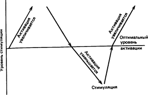 Рис. 6.2. Схема теории активации. видели, как реагирует мозг, когда он оказывается лишенным раздражителей. Понятно, что приверженцы теории оптимальной активации 1 видят в этом пример такой ситуации, которой организм стремится избегать. Как бы там ни было, но теория оптимальной активации остается по самой своей сути механистичной. И действительно, хотя эта теория и позволяет объяснить, чем вызывается какое-то поведение, она не дает никаких указаний на то, по какому конкретному пути оно пойдет.Она, например, не помогает нам понять, почему, если ваш уровень активности снижается, вы постараетесь восстановить оптимальный тонус, перелистывая этот учебник по психологии, вместо того чтобы смотреть матч по телевизору или слушать пластинку с записью классической музыки. Эта ограниченность теории отчасти объясняется тем, что большинство исследований проводилось на животных в искусственных лабораторных условиях. Теории, вытекающие из подобных экспериментов, позволяют лишь частично понять то, что происходит с людьми в их повседневной жизни, где у человека обычно есть выбор возможных действий. Именно на этом когнитивном аспекте мотивации, проявляющемся в основном у высших млекопитающих, делает упор следующая, третья группа теорий. Такие, как исследователи из Университета Мак-Гилла-сотрудники Хебба.
