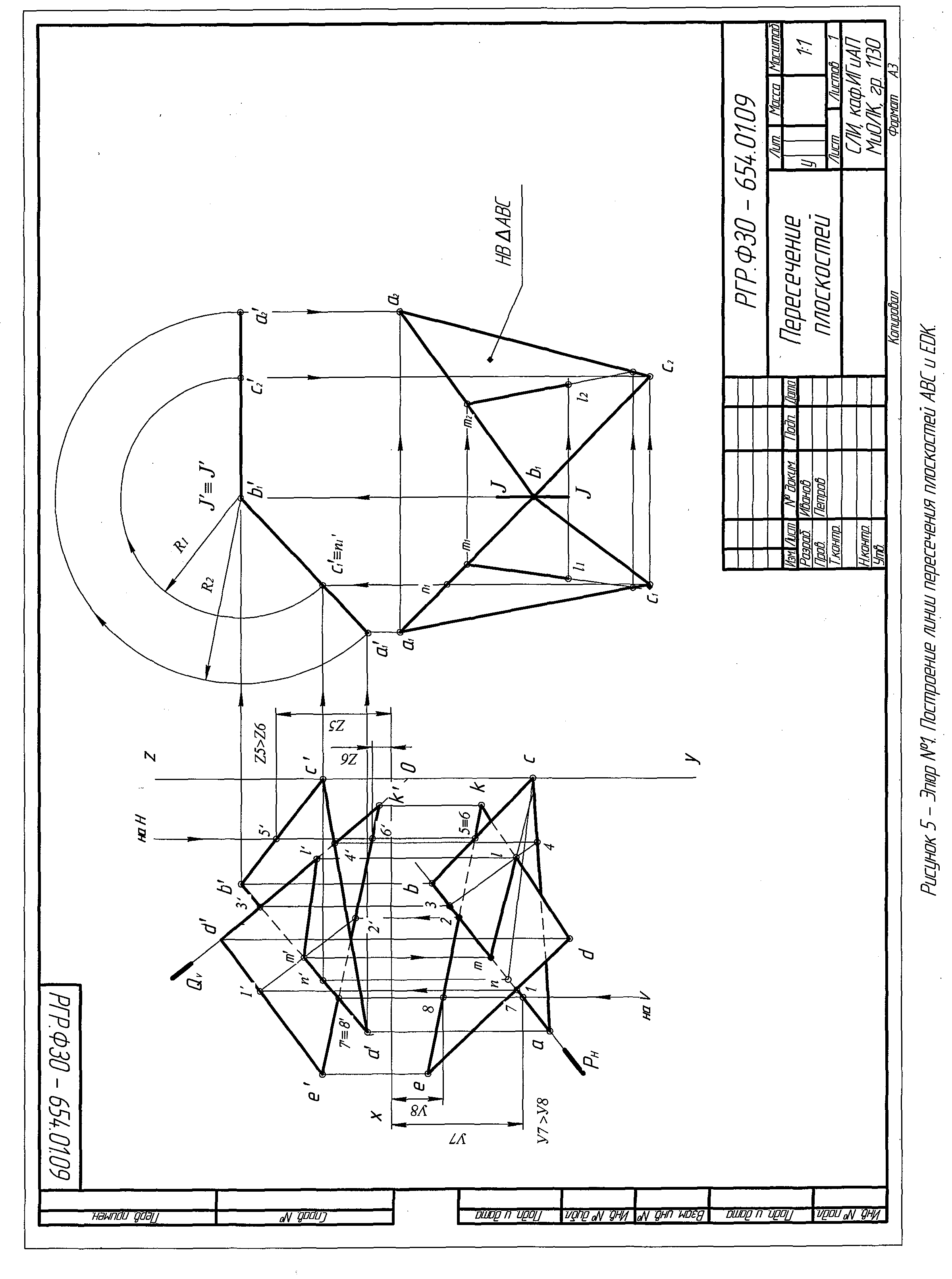 Для построения линии пересечения необходимо определить две общие точки, принадлежащие заданным плоским фигурам. Общий метод решения подобных задач состоит в том, что одну из сторон какой-либо плоской фигуры рассматривают как прямую линию и находят точку встречи её со второй плоской фигурой. Рассматриваем сторону АВ треугольника АВС как линию и находим точку М (m, m ′) встречи её с треугольником ЕDK. Для этого через сторону АВ проводим вспомогательную горизонтально проецирующую плоскость Рн v аb (Р ⊥ Н) и находим линию пересечения I – II (1-2, 1′-2′) этой плоскости Р с плоскостью треугольника EDK. Пересечение фронтальных проекций 1′-2′ и а′b′ дает фронтальную проекцию точки пересечения m′, а по ней находим и горизонтальную проекцию m, проведя линию связи. Определяем вторую общую точку, принадлежащую линии пересечения плоских фигур (АВС и ЕDК). Для этого находим точку встречи L (l l′) стороны треугольника DК с плоскостью треугольника АВС, проведя через DК вспомогательную фронтально проецирующую плоскость Qv v d′k′ (Q ⊥ V). Находим линию пересечения плоскости Q с треугольником АВС – III – IV (3-4, 3′-4′). Пересечение горизонтальных проекций 3-4 и dk дает горизонтальную проекцию искомой точки n, фронтальную проекцию n′ опрелеляем по линии связи. Соединяем одноименные проекции линий пересечения m и n; m′ и n′, получаем две проекции линии пересечения треугольников АВС и EDK (MN) mn и m′n′. Для определения видимости элементов на плоскостях проекций воспользуемся методом конкурирующих точек. Определяем видимость на плоскости Н. Берем горизонтальные проекции двух слившихся точек 5 и 6 (5, 6) (конкурирующие точки) и определяем их аппликаты. Как видно из чертежа Z 5 Для нахождения видимости на фронтальной плоскости проекций необходимо взять слившиеся фронтальные проекции двух точек 7 и 8 (7 ′, 8 ′) (конкурирующие точки) и определить их координаты У. Координата У 7
