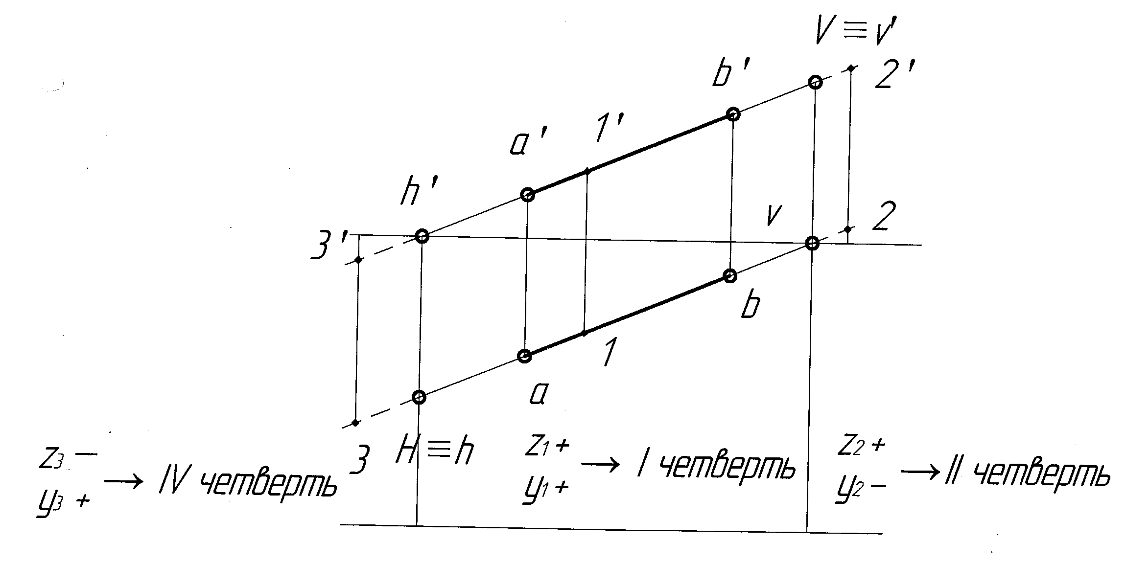 Чтобы найти фронтальный след V прямой АВ, необходимо продлить горизонтальную проекцию прямой аb до пересечения с осью Х, получим точку v – горизонтальную проекцию фронтального следа, затем восстановить перпендикуляр до пересечения его с фронтальной проекцией прямой а′b′ или с ее продолжением, получим точку v′ – фронтальную проекцию фронтального следа, которая совпадает с фронтальным следом V. Чтобы найти горизонтальный след Н прямой АВ, необходимо продлить фронтальную проекцию прямой а′b ′ до пересечения с осью Х, получим точку h′ – фронтальную проекцию горизонтального следа, затем восстановить перпендикуляр до пересечения его с горизонтальной проекцией прямой аb или с ее продолжением, получим точку h – горизонтальную проекцию горизонтального следа, которая совпадает с горизонтальным следом H. На эпюре необходимо определить четверти пространства, которым принадлежит прямая АВ, это видно из рисунка 2.5.